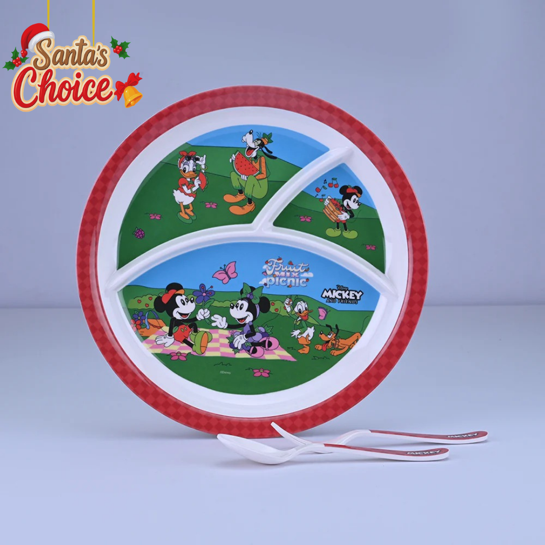 A 3pc set of plate, fork and spoon with plate having 3 parts to create fun times for kids during any meal of the day. Mickey Mouse studded plate will attract toddlers and kids with its vibrant colours that they would love to have food in. The best part is organised and mess free meals. Yayyy!