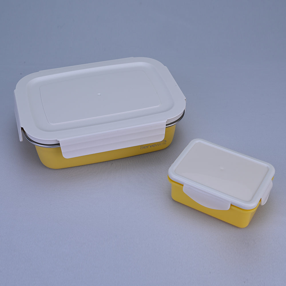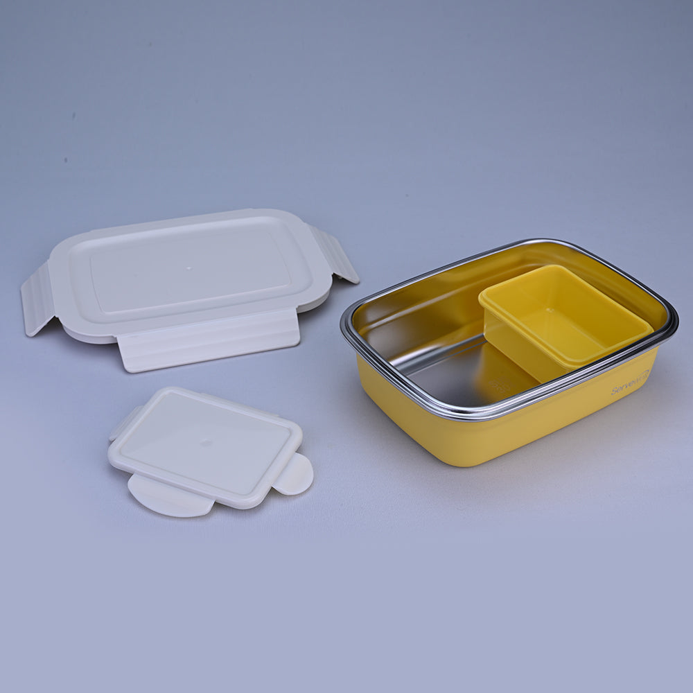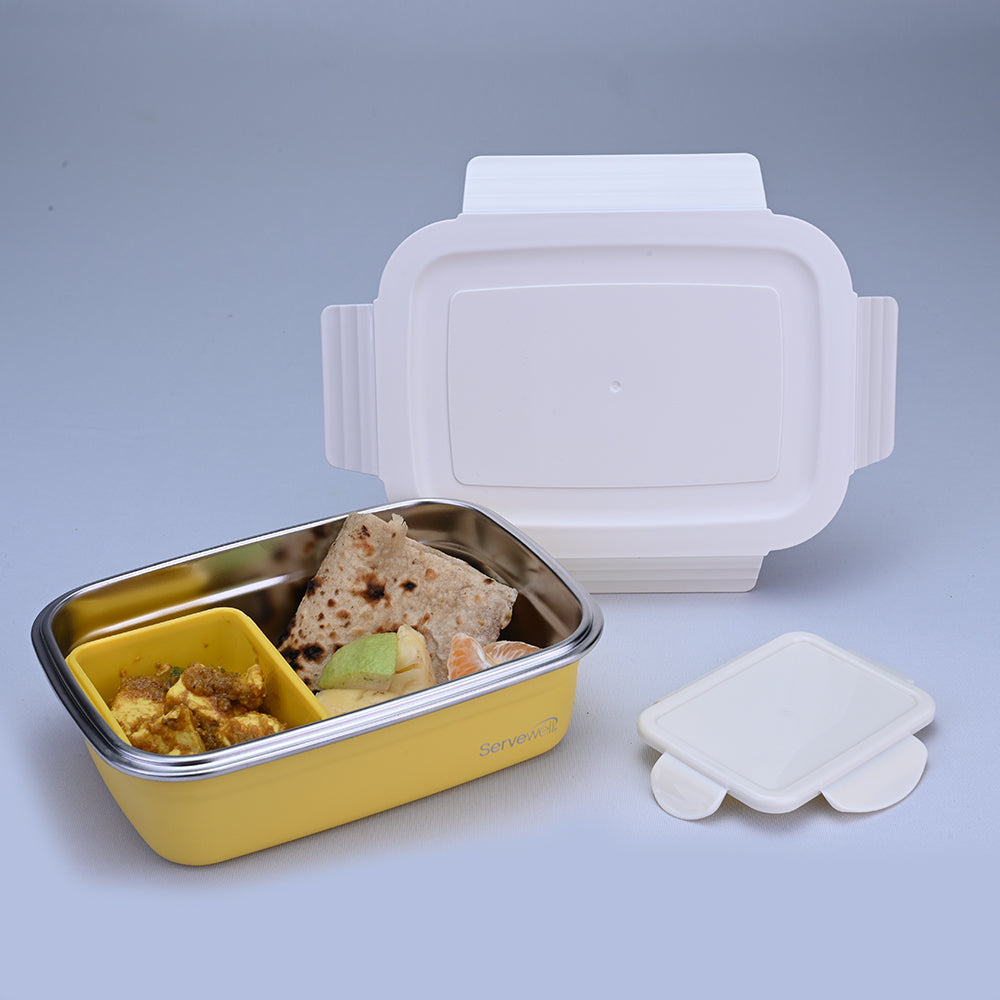 Ignite your lunchtime with a burst of sunshine using Servewell Bite Single Wall Lunch Box in a vibrant yellow hue. This 1000 ml lunch box, a perfect fusion of functionality and style, stands out with its sunny disposition. Accompanied by a complimentary free container, it adds an extra layer of convenience to your on-the-go meals. The cheerful yellow design radiates positivity, making each meal a delightful experience. Crafted with a single-wall design for a sleek aesthetic, this lunch box ensures durability and ample space for your favourite dishes. Elevate your lunch routine with the Bite Single Wall Lunch Box in Yellow, where every bite is a celebration of colour and flavour.