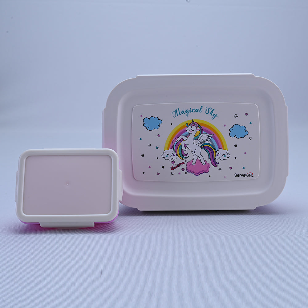 Unleash the enchantment with the Bite Single Wall Lunch Box featuring a whimsical Unicorn design! This set includes a 650 ml lunch box and a complimentary 1 pc pp Container SP 801.